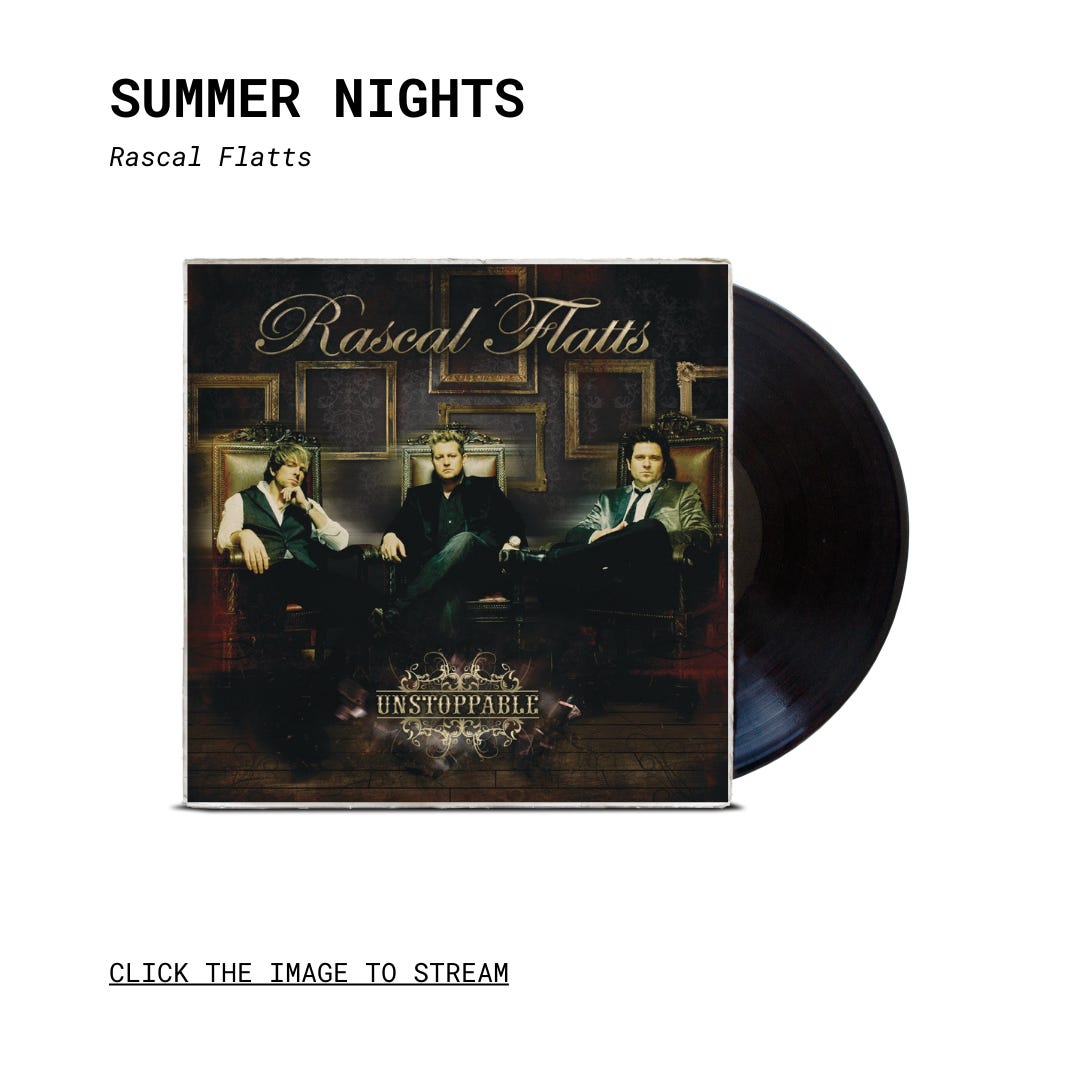 Before hanging it up in 2021, Rascal Flatts had quietly become one of the most bankable acts in country music. Since debuting in 2000, the group sold over 27 million albums, with all but two of their 10 studio LPs topping Billboard’s country chart, and over 11 million concert tickets. Though they’re primarily known for their “aw shucks” balladeering and their cover of Tom Cochrane’s “Life is a Highway,” they have some sneaky-good party anthems in their repertoire—none of which is better suited for an end-of-season bash like “Summer Nights.”